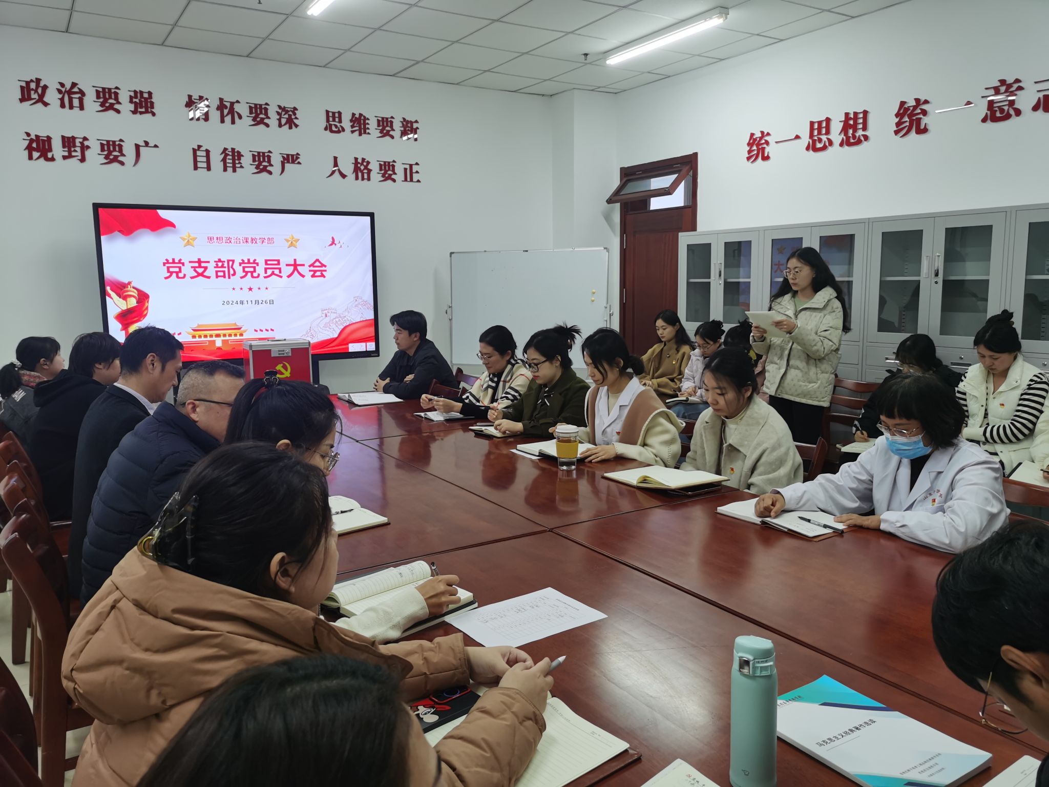11月26日下午,思政课教学部党支部在综合楼715室召开党员大会,讨论宿洁同志预备党员转正事宜。本次会议由思政课教学部党支部负责人周庆强同志主持,组织人事处组织科副科长周泰冰同志列席监督指导会议。会议应到党员25名,实到党员23名,实到会有表决权的正式党员人数超过应到会有表决权人数的半数,符合规定,本次会议有效。