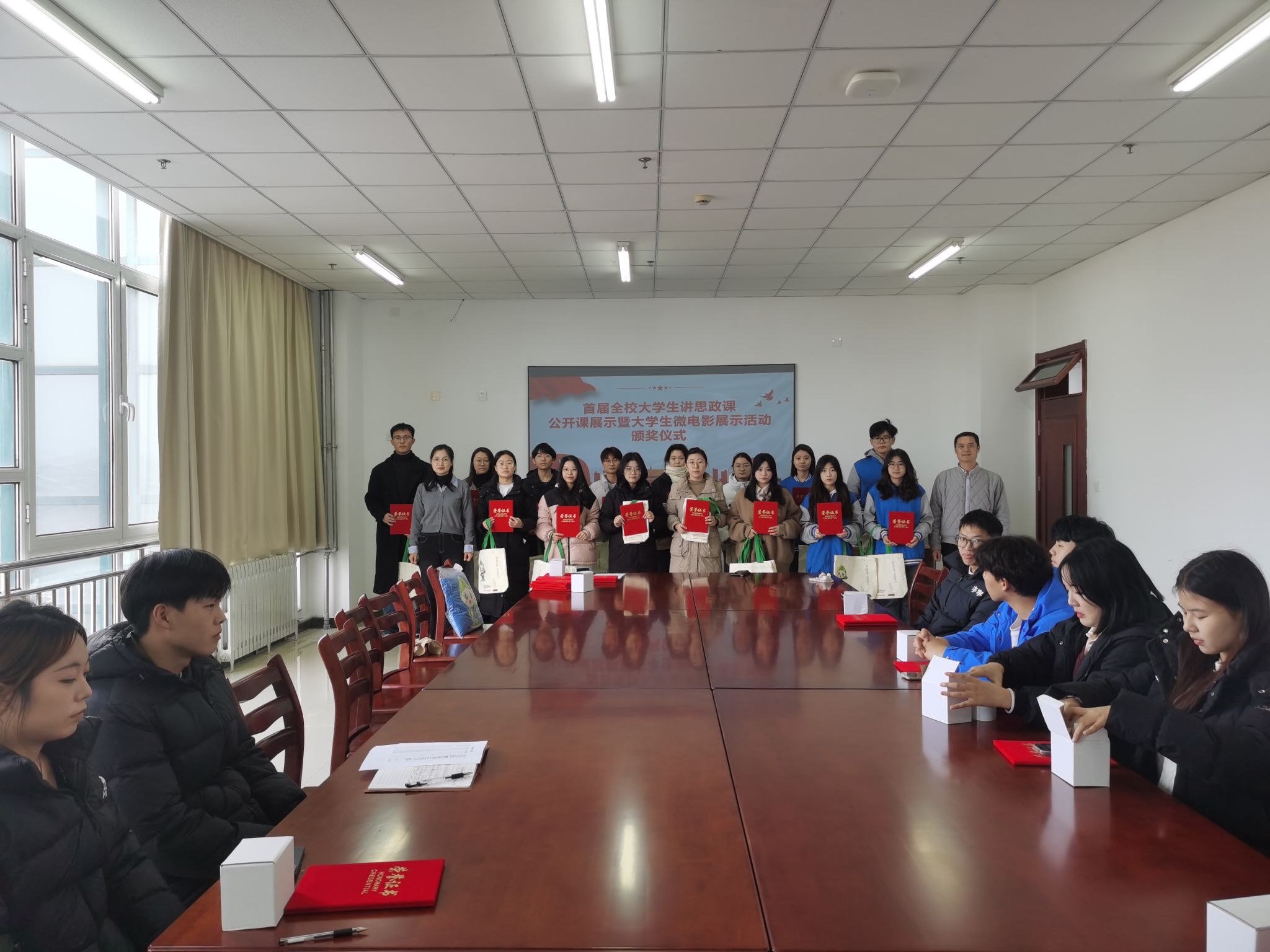 11月27日,学校首届大学生讲思政课公开课展示暨大学生微电影展示活动颁奖仪式在综合楼704室举行。思政课教学部相关负责人为获奖学生颁奖,标志着本次活动圆满落幕。