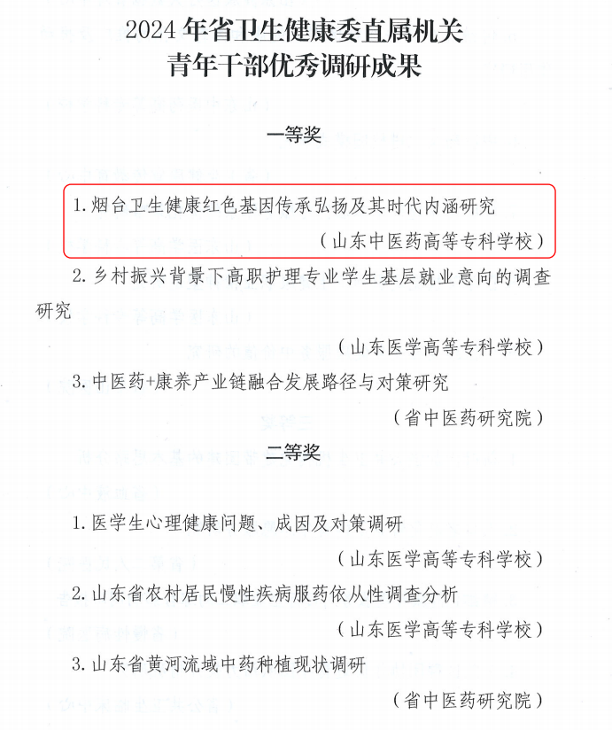 近日,省卫健委直属机关党委发布《关于表扬2024年度省卫生健康委直属机关青年干部优秀调研成果的通报》,我校思想政治课教学部申报的《烟台卫生健康红色基因传承弘扬及其时代内涵研究》荣获一等奖。