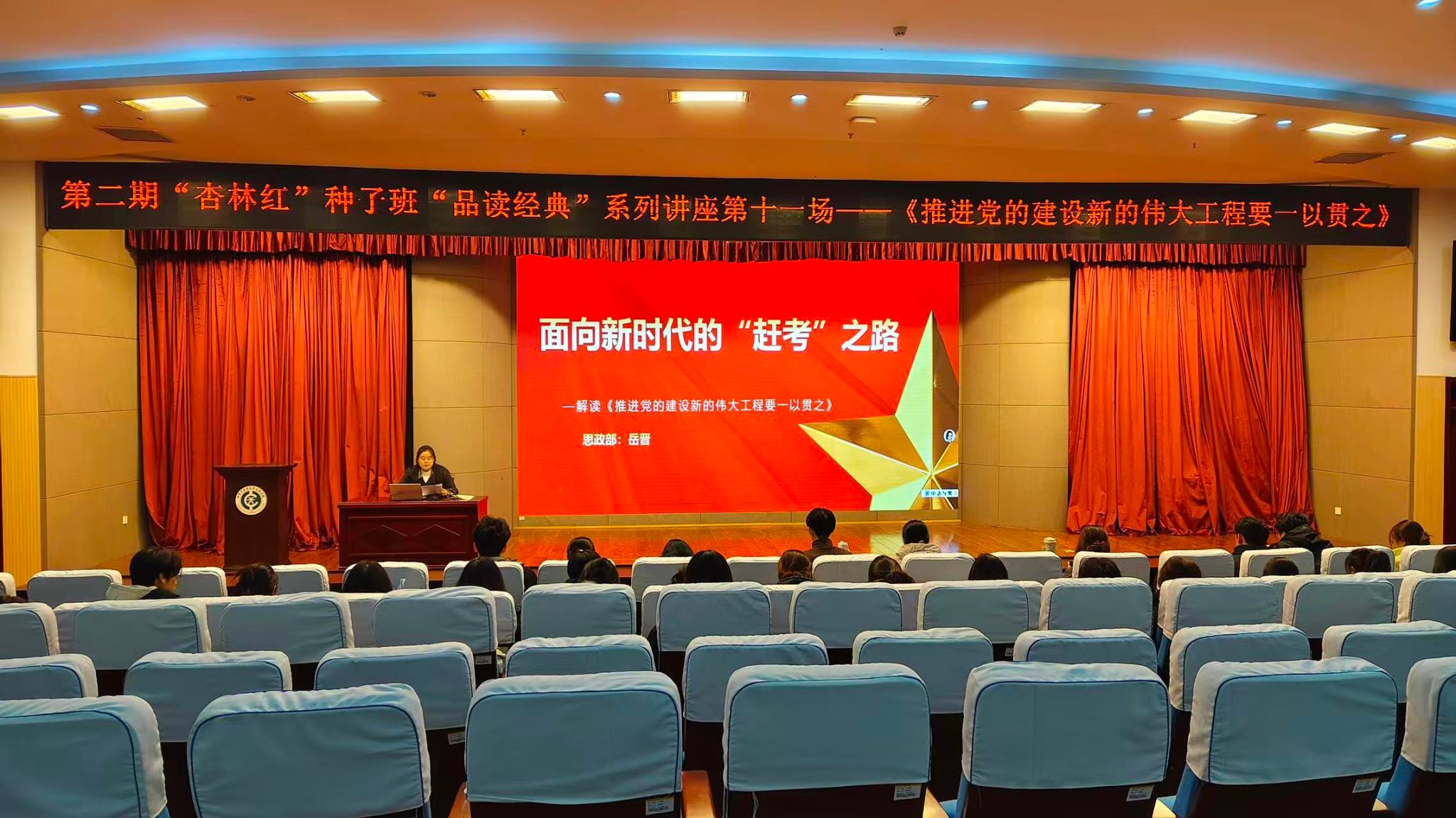 11月19日晚,第二期“杏林红”种子班第十一场“品读经典”讲座在仁和楼学术报告厅举行。本次讲座特邀思想政治课教学部岳晋老师主讲,围绕《面向新时代的“赶考”之路——解读〈推进党的建设新的伟大工程要一以贯之〉》开展专题导学,种子班全体成员参与。