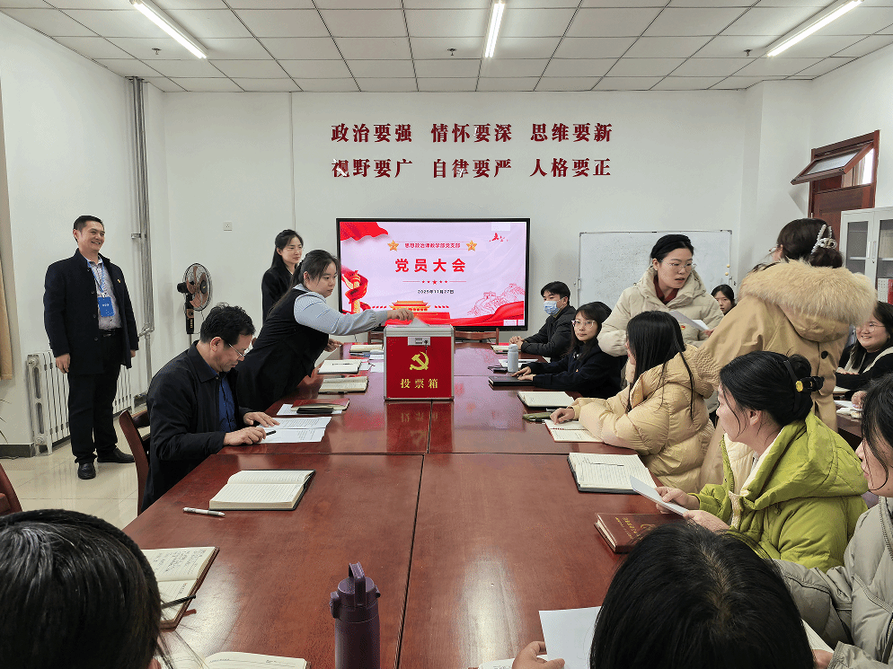 大会在庄严的《国歌》声中拉开帷幕。韩晓昌同志首先作《中共思想政治课教学部支部委员会工作报告》,全面回顾过往工作成果与经验,提请全体党员审议通过。随后,舒冠凤同志宣读《中共思想政治课教学部支部委员会选举办法》,明确选举规则与流程,经审议顺利通过。同时,大会审议确定了王雪为监票人,马卉、玄超为计票人,以及支部委员会委员候选人名单,包括孙铭泽、辛泽华等6位同志。