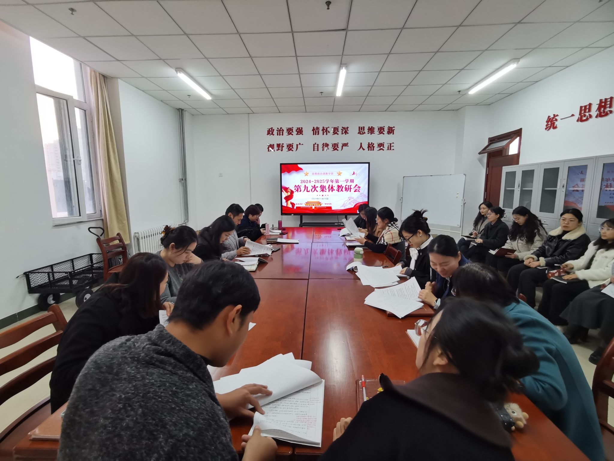 11月19日,思政课教学部在综合楼715室成功举行了第九次集体教研活动。本次活动旨在检查新教师手写教案的规范性与质量,分享暑期国家级培训的心得体会,并深入学习学校的教学纪律文件,进一步提升思政课的教学质量和教师队伍的专业素养。