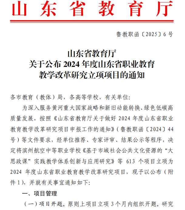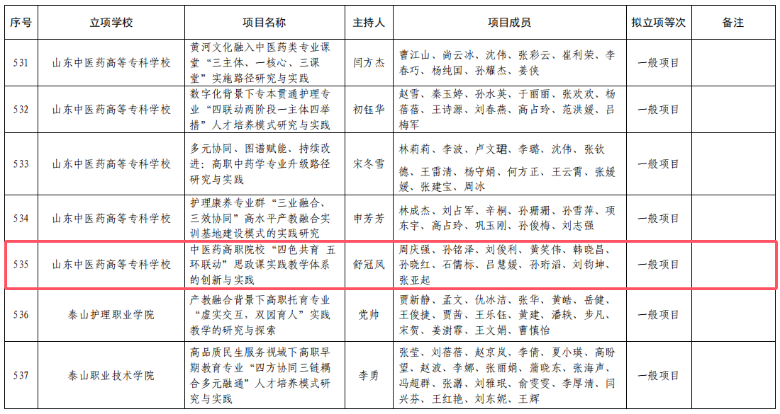 近日,山东省教育厅发布《关于公布2024年度山东省职业教育教学改革研究立项项目的通知》(鲁教职函〔2025〕6号),我校思政部推荐上报的《中医药高职院校“四色共育 五环联动”思政课实践教学体系的创新与实践》获批立项。
