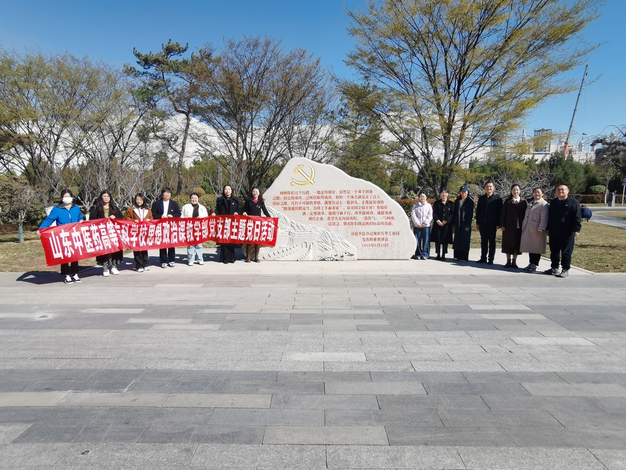 4月3日上午,思想政治课教学部党支部走进胶东(烟台)党性教育基地万华教学点开展主题党日活动。在万华展馆,思政部全体党员集体观看了万华集团的宣传片,认真学习聆听了习近平总书记在烟台万华集团考察时的讲话视频。随后,讲解员详细介绍了万华集团的整体布局、发展理念、科技产品及人才战略和企业文化,大家通过一幅幅照片、一个个故事感悟万华“奋战西沙湾、建设合成革”到全球领先的化工企业奋斗史,通过一件件产品、一项项数据感悟万华“化学,让生活更美好”的使命与担当。在观景平台,思政部全体党员俯瞰万华产业园区,亲身体验万华“看不见、听不见、闻不见”的“三不见”先进管理理念。