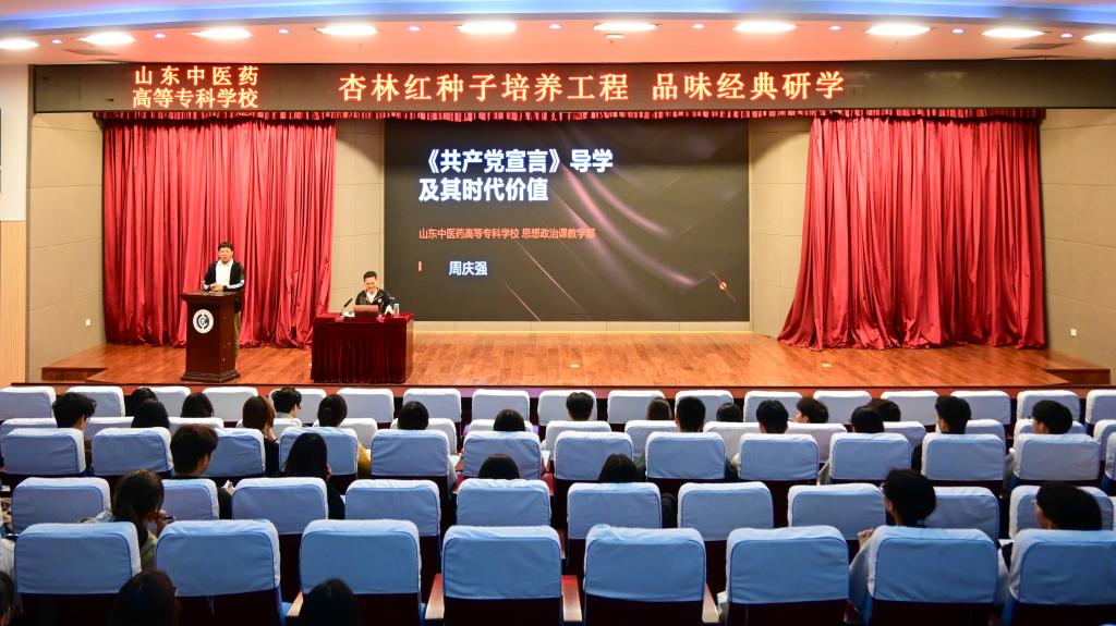 4月29日,“杏林红”种子培养工程——“杏林红”种子班举行第一场品味经典研学活动,思政部部分教师及60余名种子成员参加活动。思政部副主任周庆强以《<共产党宣言>导学及其时代价值》为题,与师生分享了学习体会。本次研学活动由思政部思想道德与法治教研室主任刘俊利主持。