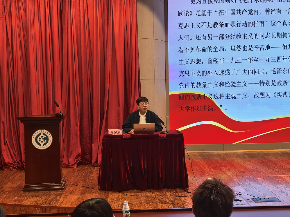 刘俊利老师首先解析《实践论》的创作背景。他指出,面对党内教条主义盛行、理论与实践脱节的严峻现实,毛泽东以马克思主义认识论为武器,系统批判主观主义错误,为全党统一思想、凝聚抗战力量提供了科学的世界观与方法论。接着,他深入剖析《实践论》的三大理论支柱:其一,实践是认识的唯一来源,生产活动作为最基本实践形式,决定人类社会关系的本质。其二,实践是检验真理的唯一标准,毛泽东以“真理的标准只能是社会的实践”这一论断,破除唯书唯上的思维桎梏。其三,实践与认识的矛盾运动推动社会进步,从感性认识到理性认识的飞跃,最终需要回归改造世界的实践。结合中医药院校的特色,他强调中医药学子要破解“读死书”与“死读书”的困局。最后,刘俊利老师将《实践论》与新时代青年使命紧密连接。他强调,中医药人既要‘坐得住冷板凳’钻研古籍,更要‘迈得开双腿’服务百姓。面对乡村振兴需求,中医药学子当以“俯身乡野践医道,悬壶济世暖民心”之姿,让岐黄之术扎根乡土、惠泽苍生。