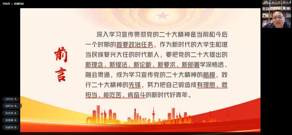 为深入宣传贯彻落实党的二十大精神,教育引导大学生坚决以中国化时代化的马克思主义武装头脑,不断增强“四个意识”、坚定“四个自信”、捍卫“两个确立”、做到“两个维护”的思想自觉和行动自觉,努力成为有理想、敢担当、能吃苦、肯奋斗的新时代好青年。思想政治课教学部于12月8日至11日,利用思政课堂在全校青年学生中集中开展党的二十大精神主题宣讲,积极推动学习宣传贯彻落实党的二十大精神“三进”工作。