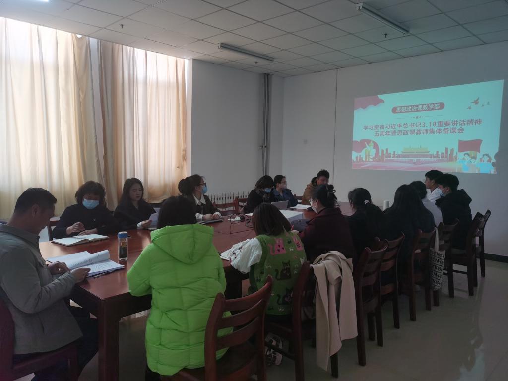 3月19日,思政部组织全体教师在综合楼709室召开集体备课会,重温习近平总书记在2019年3月18日思想政治理论课教师座谈会上的重要讲话精神,激励全体教师牢记教书育人的职责使命,凝聚起打造新时代高质量思政课的信心和决心。会议由思政部副主任周庆强主持。