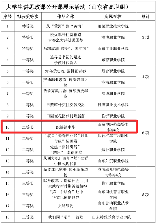 第八届全国高校大学生讲思政课公开课展示活动评审结果近日揭晓。学校推选的作品《织锦绘中华》荣获高职组二等奖。本次活动由教育部高校思政课教学指导委员会主办,南开大学马克思主义学院承办,共有全国1339所高校提交的5007部大学生讲思政课公开课作品。山东省内15所高职院校的18个作品榜上有名。