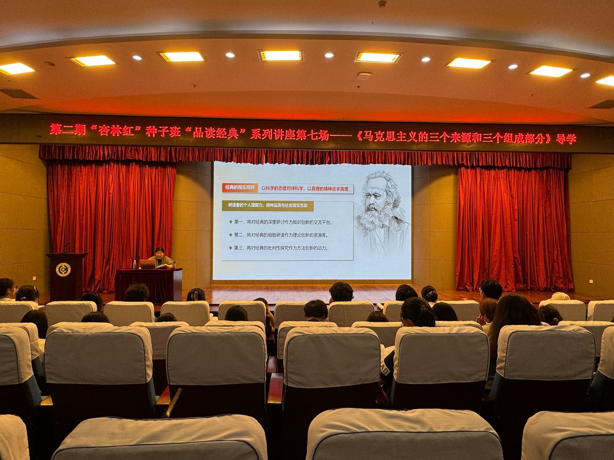 6月25日,学校第二期“杏林红”种子班“品读经典”系列讲座第七场在仁和楼学术报告厅成功举办。本次讲座聚焦经典著作《马克思主义的三个来源和三个组成部分》,由思政课教学部王雪副教授主讲。