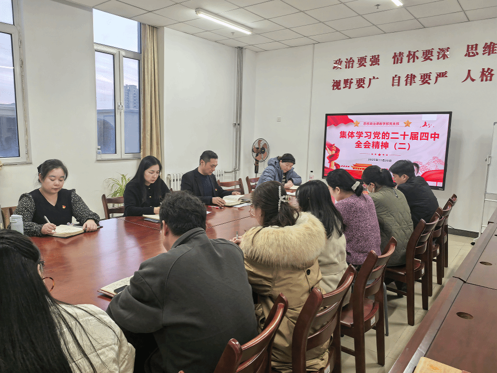 活动聚焦党的二十届四中全会精神学习,全体党员认真研读“十五五”规划全文第三部分内容。周庆强同志结合思政课教学实际,深入解读文件,引导党员将理论学习与教学紧密相连。党员们积极讨论,一致表示要以全会精神为指引,提升政治素养与业务能力,把党的先进理论融入思政课堂,为培养时代新人贡献力量。