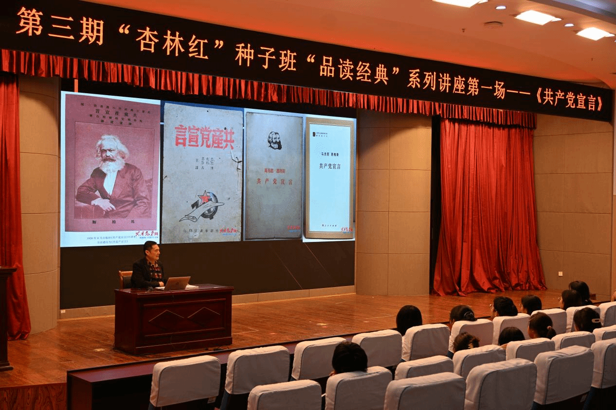 4月13日晚,第三期“杏林红”种子班第一场“品读经典”讲座在仁和楼学术报告厅成功举办。思政部副主任周庆强以《<共产党宣言>导学及其时代价值》为题开展专题分享,第三期杏林红种子班全体成员及指导教师共同参与本次学习活动。